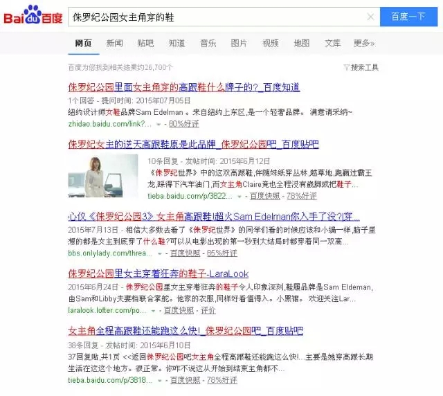 且现如今的植入均是建立在众多大牌明星团的基础上,就影响力、话题力而言,更有吸引力,也许消费者不知道你的品牌是什么,但是,作为粉丝来说,他们会主动去搜索和关注“星星”们都使用了什么产品,是什么牌子的,由此形成的记忆效果更强烈,氛围更浓烈。最新上映的《侏罗纪公园》中,给人印象最深刻的当属女主角脚上的那双鞋,穿丛林,越草地,跑赢过霸王龙,踩得下汽车油门,而女主角Claire竟也全程没有崴脚或把鞋子甩飞,通篇下来,谁也不知道那双鞋是哪个牌子,可是却吸引了大量的受众主动搜索,仅百度词条的搜索量就达到了30多万,经过搜索才知道是纽约的一个轻奢品牌SamEdelman。那双高跟鞋在我近期的脑海记忆里,绝对是占据首位的。