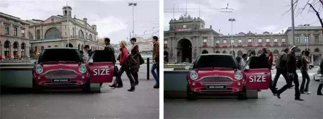 把MINI车身贴在隧道进出口,远远看上去好像很多人正在进出MINI车,可见其车厢有多宽敞!