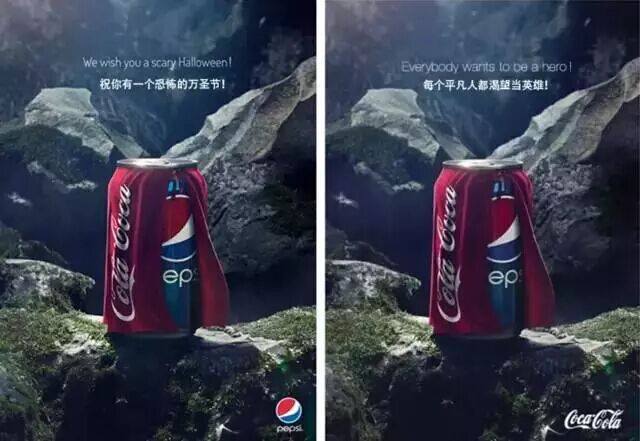 2014万圣节百事可乐在万圣节做了一个广告讽刺可口可乐,结果被可口可乐用同样的广告反击。第一幅图,百事可乐的意思是穿着印有可口可乐的披风是用来吓唬人的! 第二幅图,可口可乐的意思是,百事可乐是平凡的,平凡的人渴望当英雄,所以穿上了可口可乐的披风!可口可乐象征着英雄。