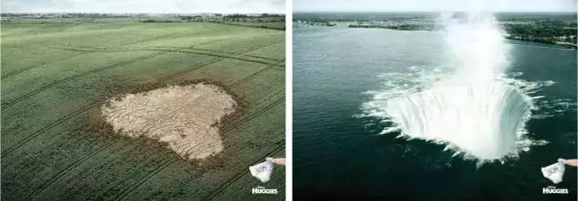 HUGGIES(好奇)尿不湿把草地和海洋都吸干了,细水性能果然够强劲。这两则广告直接夸张产品的功能——吸水,使画面传达的主题信息非常清晰。宝宝用了这样的尿不湿睡觉,妈妈肯定放心了。