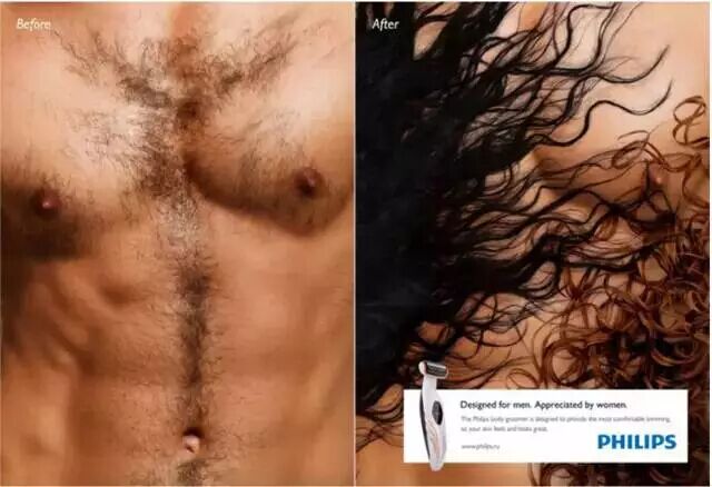 剃毛器广告:这是一组相当有内涵的广告,这支广告由对比图组成,一边是毛背心一边是美女的秀发,哪一边的男人更有吸引力,答案不言而喻。