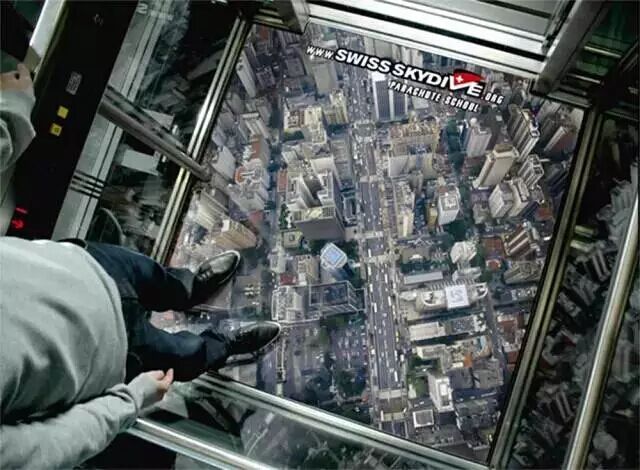 跳伞不同于游乐园的过山车,敢体验这项运动的毕竟是少数,那么跳伞到底是一种什么样的感觉呢?很多高层的商场或者写字楼都有高空玻璃电梯,安全坚硬的全透明地板,走上去又颤抖又壮观。这不,点子来了,不就是模拟高空下坠感嘛,全透玻璃电梯就能做到,若还想更刺激一些,就来我们的跳伞学校把!